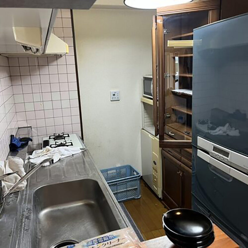 スタッフ4名でお片づけをさせて頂きました!キッチンには大型冷蔵庫のほかに米びつ、空気清浄機、生ごみ処理機、鍋、やかん、食器、調理器具などたくさん!